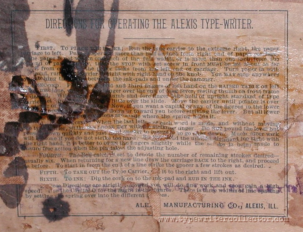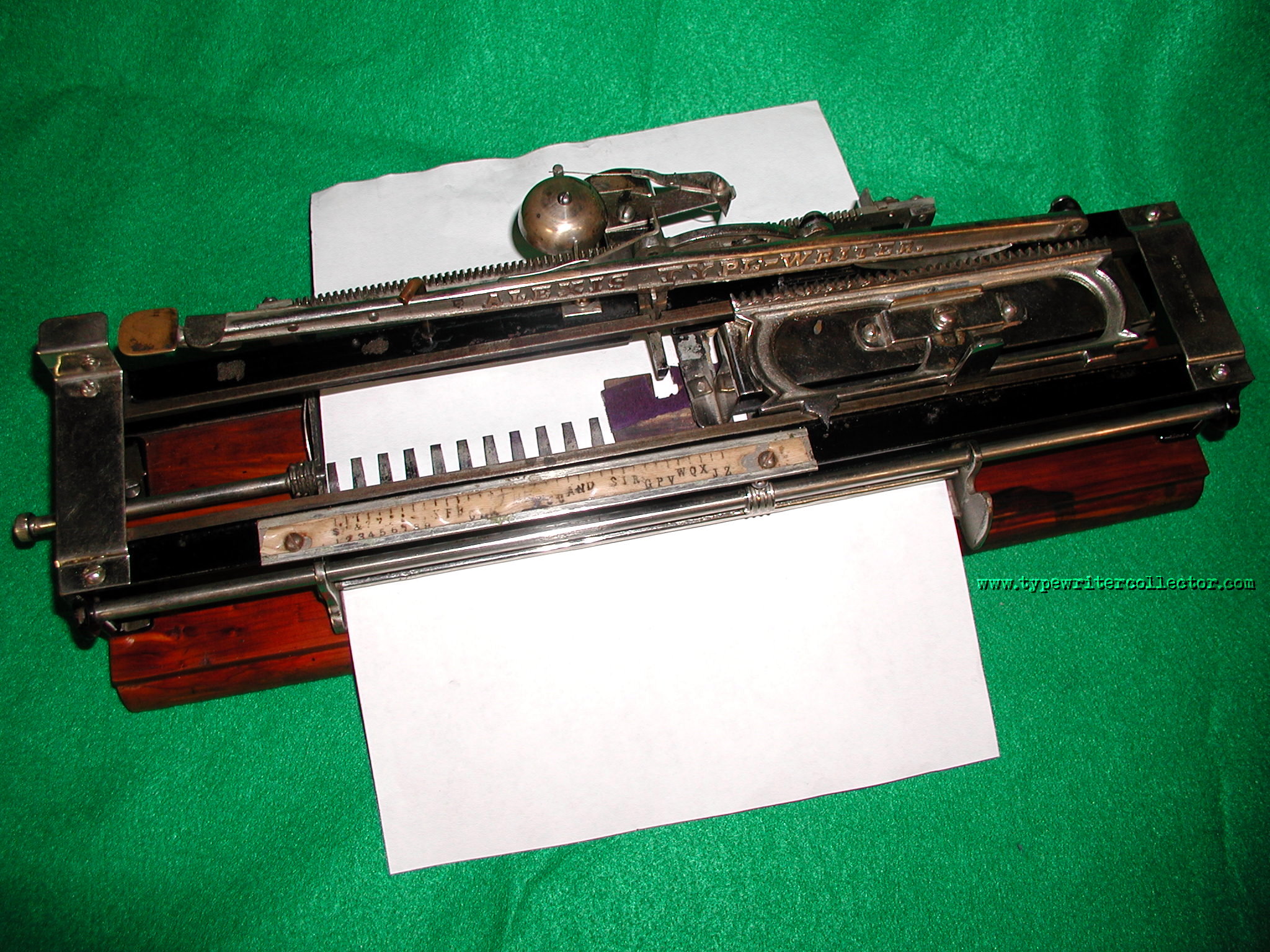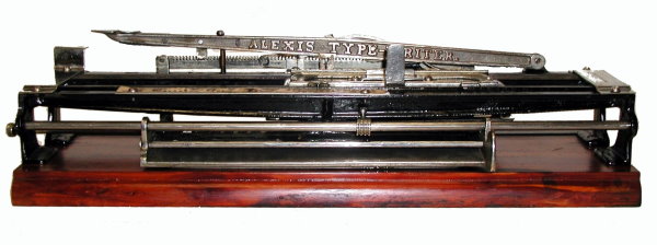 The Alexis is a linear index typewriter, the invention of James A. Wallace, of Alexis, IL. It was officially named “THE ALEXIS TYPE-WRITER” for which Wallace received United States Patent #423644 on March 18, 1890. The Alexis measures 16+” wide, 6″ deep and 5″ tall. Its extra wide base allows for a paper transport carrier to travel inside its body, across the entire writing line, similar to that of the extremely rate Boston typewriter. The paper lays flat on the transport carrier as it moves horizontally across the writing line. Characters are selected from a linear index at the top of the machine and printed as the operator presses a lever in the rear left corner, sending a hammer above a rubber type plate into the desire character for printing.
